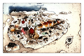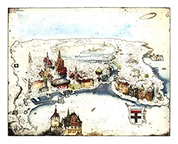 Merian sind Stadtansichten im Charakter der Veduten- und Landschafts-Kupferstecher der Renaissance- und Barockzeit.
